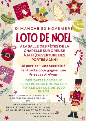 🎉 Notre LOTO DE NOËL, organisé par le Club des loisirs Chapelin, débarque à la Salle des Fêtes avec 18 parties, une spéciale à l’entracte, une Airfryer flambant neuve à gagner et plus de 1000 € en cartes cadeaux Leclerc.